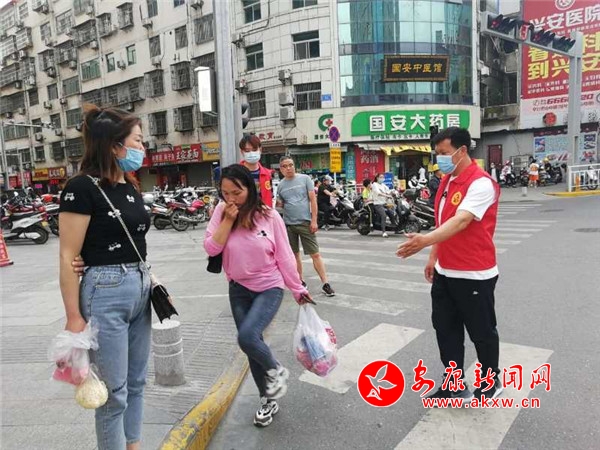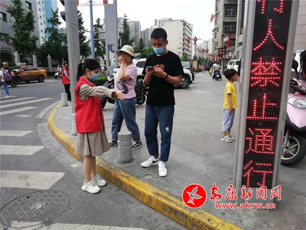 “你好,請走人行道”“綠燈亮了,再過斑馬線”……戴著口罩,統一身穿紅色馬甲的文明勸導員,在十字路口溫馨地對過往行人勸導著。