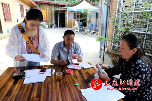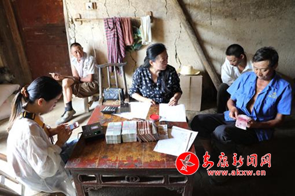 8月6日中午1點,在鳳凰村12組,合作社財務人員楊海江用休息時間給在園區務工人員發5月和6月工資。