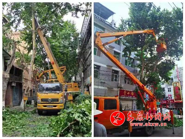 修剪現場,社區志愿者積極協助維護現場秩序,同時,修剪工人利用機械作業車、樹木粉碎機、電鋸等專業工具對梧桐樹進行高空作業,經過近幾天的徹底修剪,整個大、小北街亮了起來,附近居民紛紛拍手叫好,此次修剪不僅解決了困擾居民許久的采光難題和安全隱患,也還給了居民一個安全舒適的居住環境。