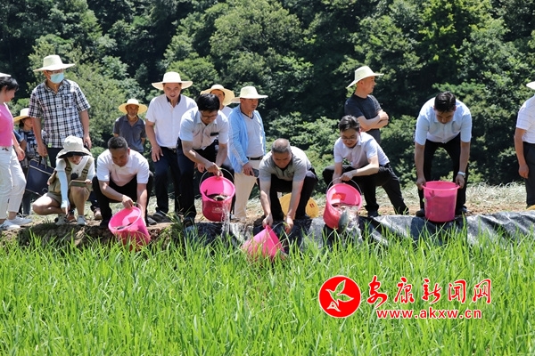 本網訊(通訊員 周濬)“稻在水中長,魚在稻下游。”6月22日,位于安康市漢濱區北山的大河鎮流芳村,村民在稻田里投放魚苗,一幅秧苗青、魚兒歡的田園畫卷鋪展開來。