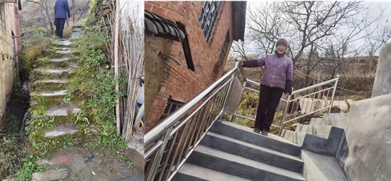 由于鄧大芝老人年事已高,門前土石坎年久失修、坡陡路滑,“出門是陡坎、雨雪出行難”,成了她“急難愁盼”的心頭事。2021年10月,在黨史學習教育中,安康農商銀行深入幫扶的沈壩鎮富田村問需求、聽訴求,為群眾解難事、辦實事,了解到這一情況后,總行領導立即帶領設計施工人員現場辦公,制定修繕方案,撥付專項費用,加快修繕進度,徹底解決老人出行不便問題,并對院壩、廚房一并進行維修,改善居住生活條件,并定期上門看望慰問。