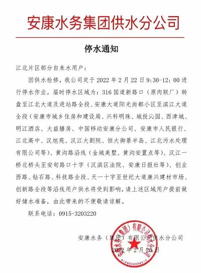 本網(wǎng)訊 2月20日,據(jù)市水務(wù)集團(tuán)公司消息,因供水檢修,2月22日9:30至12:00江北片區(qū)將進(jìn)行停水作業(yè),屆時用戶供水將受到影響請?zhí)崆白龊脙λ疁?zhǔn)備。68K安康新聞網(wǎng)
