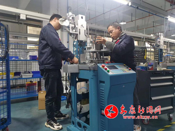 在安瑞智能制造公司試車間,工人們對一臺臺織襪智能一體機進行出廠前調試。這臺機器即將交付百潤襪業有限公司。“織縫翻一體智能織襪機結合了織襪,縫頭,翻襪三道工序,通過電腦系統控制一次完成,從而大大縮短了生產周期,減少生產場地,減少工人使用量等優點,降低了生產成本,增強了市場競爭力,這和傳統襪機相比襪子織好翻過來送到縫頭車間縫合后再翻過來送到下道工序,具有革命性的突破。”投資公司總經理汪海寧介紹道。