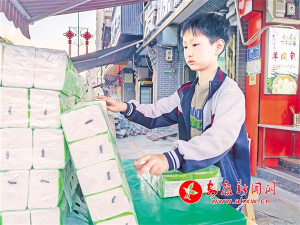同時,花三還將丁凱家的情況介紹給了身邊的朋友,并把丁凱家的情況和小文杰賣紙巾的事拍成了小視頻,在抖音平臺發(fā)布。在花三和其他網友的共同推動下,越來越多的愛心人士聯(lián)系上了丁凱,愿意免費為他們提供場所,讓他們擺放餐巾紙自助銷售。