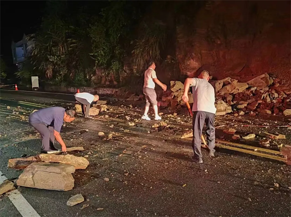 “G211省道,陽(yáng)坡村9組瀛湖加油站對(duì)面山體發(fā)生嚴(yán)重塌方,大量落石滾落堆積在主干道路上,嚴(yán)重危及來(lái)往車輛行車安全。”7月18日凌晨1:58分,一道尖銳的手機(jī)鈴聲將陽(yáng)坡村黨支部書(shū)記晏真云從睡夢(mèng)中驚醒,在得到消息后,陽(yáng)坡村四支隊(duì)伍迅速集結(jié),帶著鐵鍬、手套等工具第一時(shí)間沖向塌方路段,對(duì)落石及淤泥進(jìn)行清理搬運(yùn)。