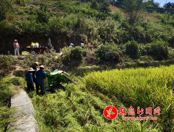 一陣輕風吹過,放眼望去,稻浪翻滾,遍野稻香,村民們收割作業的身影穿梭其中,與金色的稻田相映成趣,豐收的喜悅奏響了鄉村振興的奮進曲。
