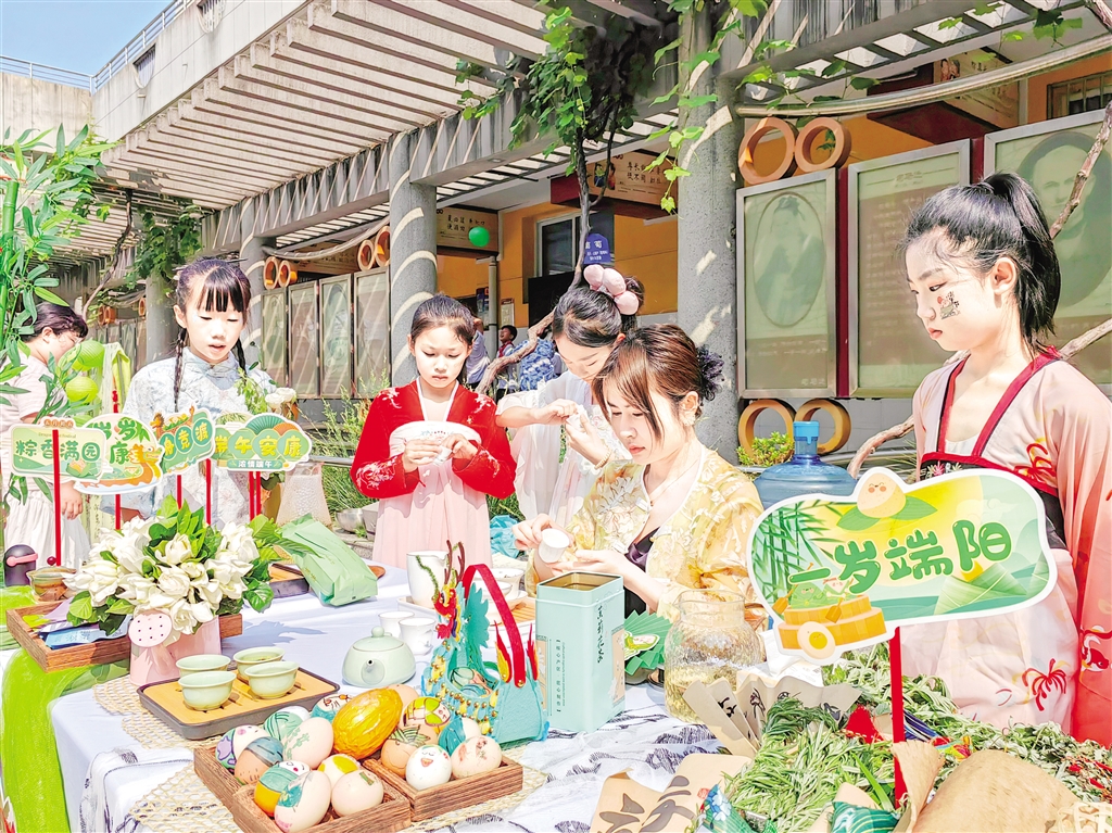學生們身著漢服與“我們的節日·端午”主題文化節背景墻合影