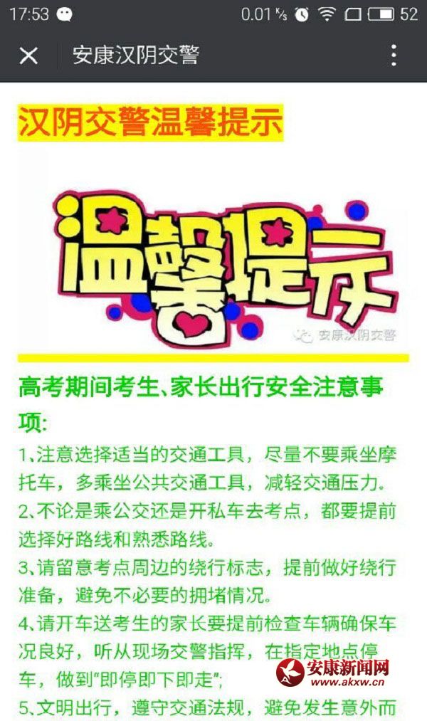 漢陰交警在此祝愿廣大莘莘學子圓夢高考,金榜題名!祝各位駕駛員朋友及交通參與者生活愉快,平安出行!htR安康新聞網