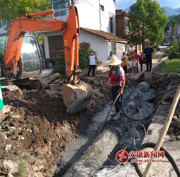 6月20日,雨后初晴,在漢陰縣城關鎮五一村主干道三組,切割機作業過后的道路斷面處,有挖掘機接著挖深、挖寬,施工人員忙著安放管道,再澆灌混凝土,砌縫等處理工作。附近的村民主動從家里端茶倒水,熱情地招呼施工隊員們飲用。 LVX安康新聞網