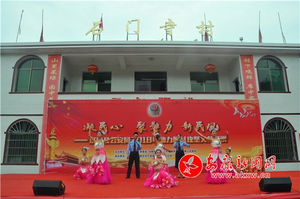 活動對石門寺村涌現(xiàn)出的3名優(yōu)秀共產(chǎn)黨員、3名脫貧攻堅自強標兵、3名文明衛(wèi)生示范戶、2名好婆婆和2名好媳婦進行了表彰。活動文藝節(jié)目演出在舞蹈《盛世歡歌》中拉開序幕,巡特警大隊民警表演的《擒敵拳》《硬氣功》,虎虎生威、技驚四座,讓群眾見證了漢陰公安維護平安的本領(lǐng)和力量;交警大隊表演的《交警指揮手勢操》整齊劃一,既向群眾宣傳了交通安全知識,又體現(xiàn)了交警規(guī)范執(zhí)法執(zhí)勤水平;在《警犬演練》中,警犬歐巴、華仔登場,分別進行了服從、搜毒、反暴恐等科目表演,展現(xiàn)了漢陰公安警犬中隊從無到有、從有到精的變化;巡特警大隊民警劉鵬表演的獨唱《父親》和城關(guān)派出所民警表演的三句半《警民共奏扶貧曲》情感豐富、寓教于樂,深受群眾喜愛;歌舞《陜南民歌聯(lián)唱》和《漢陰,我可愛的家鄉(xiāng)》,歌聲悠揚、舞姿優(yōu)美,贏得現(xiàn)場觀眾陣陣掌聲。