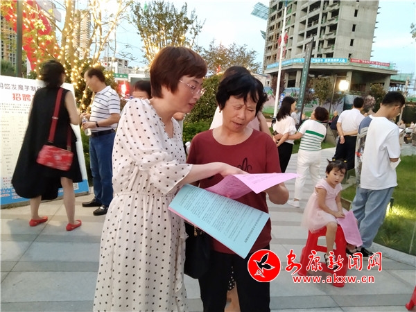 當晚七點,各展位攤前,人來人往,熱鬧非凡,有帶著孩子的婦女為丈夫咨詢的,有老人為自己的兒女詢問的,也有剛畢業的大學生來找合適崗位的,前來咨詢的絡繹不絕。家住城關鎮御景龍城的蔣友愛女士,早早地來到招聘現場,在展位攤前駐足、詢問招聘信息。據她介紹,今天在這里是想給女兒找一個合適的崗位,女兒去年大學畢業,一直呆在西安,最近想回家在家附近找個工作。她表示,今天的崗位多,好多企業開出的工資待遇也還不錯,把招聘信息拿回去拍給女兒看,女兒能留在身邊就業掙錢,還能照顧家里,最好不過啦。