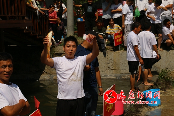 “抓魚比賽開始……“隨著一陣陣吆喝聲,不遠(yuǎn)處的稻田里,圍觀者把稻田圍得密不透風(fēng)。哨子聲一響,只見各村參賽選手們脫鞋挽袖赤腳,沖進(jìn)泥水中彎腰低頭摸魚開始摸魚,圍觀的村民們不約而同地息聲屏氣。“抓住了!”忽地探入水中的手停住了,選手吆喝了一聲,逮到魚兒的選手激動(dòng)不已,高高舉起鮮活扭動(dòng)的魚兒。頓時(shí)稻田上空一陣歡呼,大家歡聲笑語打成一片……選手們徒手捉魚,高高舉起 “戰(zhàn)利品”放聲歡呼,享受捕獲魚兒帶來的喜悅,滿臉泥漬也掩蓋不住內(nèi)心的歡喜。