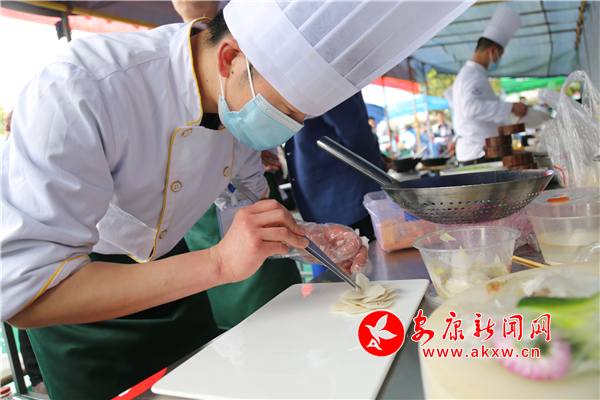 比賽現場,一個個灶臺熱火朝天,參賽選手或精雕細琢,或揮鏟舞勺,按照色、香、味、形四項標準,充分發揮自己的精湛廚藝,熱油、翻炒、調味,現場菜香撲鼻,美食盛宴讓人垂涎欲滴,觀賽人員看得津津有味。評審組人員現場專業的品嘗、打分。
