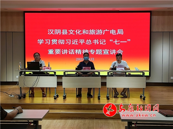本網訊(通訊員 成濤)為深入學習宣傳貫徹習近平總書記在慶祝中國共產黨成立100周年大會上的重要講話精神,引導廣大黨員干部深刻領會把握“七一”重要講話的重大意義。8月11日下午,漢陰縣文化和旅游廣電局舉辦學習貫徹習近平總書記“七一”重要講話精神專題宣講會。
