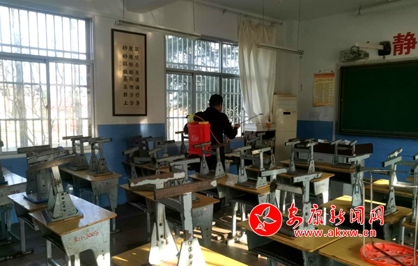 王懷軍為學生活動場所消毒 劉彩霞 攝