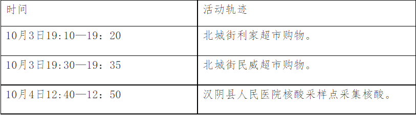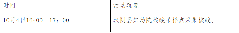 根據(jù)流調(diào)情況,現(xiàn)將漢中一例初篩陽性病例涉及密切接觸者在漢陰縣公共場所活動軌跡公布如下: