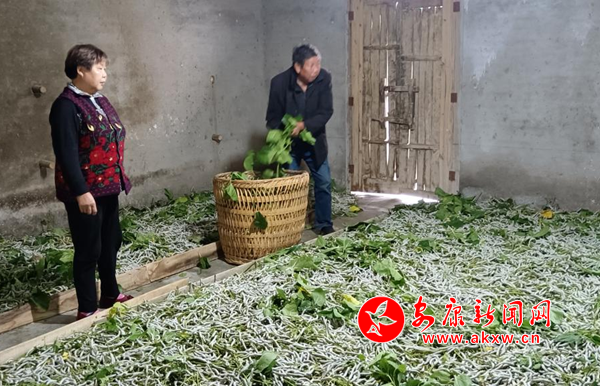 在南窯村家庭養殖合作社,蠶子正趕上四齡期,每天要吃三遍桑葉,早上要上山采摘桑葉,采回來后要進行清洗、消毒,然后再給蠶喂,蠶桑合作社負責人王祖忙得不可開交。9x3安康新聞網