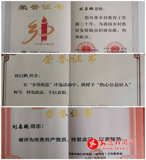 劉啟鵬先后獲得教育部、人力資源和社會保障部授予“鄉村學校從教30年”榮譽證書,被區鎮評為“鄉賢模范”和“優秀共產黨員”等先進個人。PGR安康新聞網