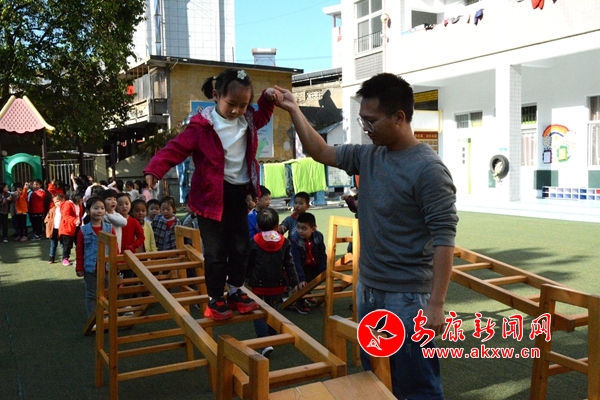 在嵐皋縣第二幼兒園,來自新北區銀河幼兒園教師魏劍正和小朋友們在室外活動,在他的不斷引導鼓勵和示范帶動下,小朋友們大膽嘗試高空過木橋。c4K安康新聞網