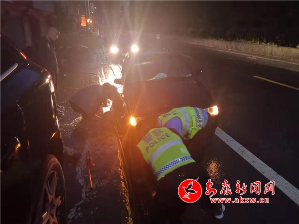 嵐皋交警:外地車輛雨夜側滑 警民聯手冒雨救助顯真情