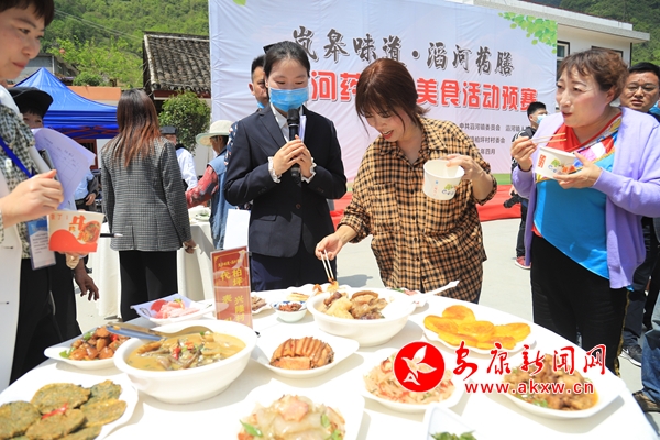 暢游清幽藥谷之鎮,品嘗農家藥膳美食。活動現場,人潮涌動,十分熱鬧。山藥燒排骨、槐花雞蛋、青蒿牛肉餅、香酥芍藥花、蠻子藥炒雞蛋……一道道現場烹飪制作的美食,極具本土特色,令人垂涎三尺……讓人“食”指大動,引得近千名村民和外地游客“味蕾大開”,爭相品嘗,舌尖上的鄉愁和美景第一次在這個四月深刻交融。