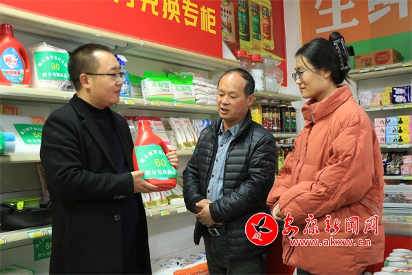 11月28日,王江灃(左)給陳吉普(中)和劉冰冰(右)介紹小區“愛心超市”積分兌現情況。陳延安/攝D6z安康新聞網