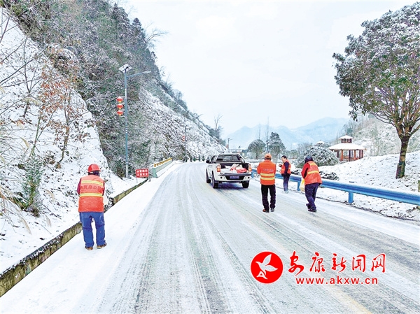 養(yǎng)護(hù)道工在G541國道柏枝埡隧道洞口附近拋灑融雪劑 劉翔 攝