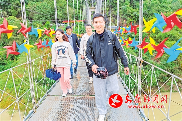 游客穿過金馬吊橋,前往馬宗村觀光。