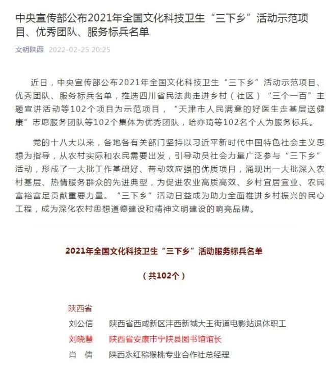近日,中央宣傳部公布2021年全國文化科技衛生“三下鄉”活動示范項目、優秀團隊、服務標兵名單,推選四川省民法典走進鄉村(社區)“三個一百”主題宣講活動等102個項目為示范項目,“天津市人民滿意的好醫生走基層送健康”志愿服務團隊等102個集體為優秀團隊,哈亦琦等102名個人為服務標兵。其中,寧陜縣圖書館長劉曉慧獲評2021年全國文化科技衛生“三下鄉”活動服務標兵。S58安康新聞網