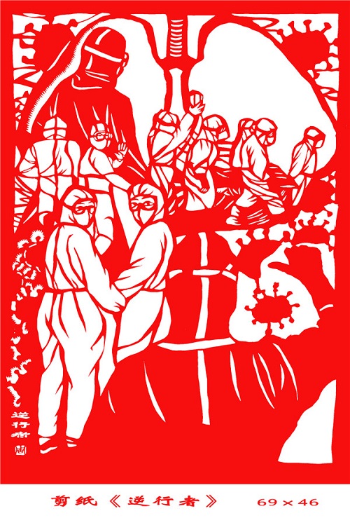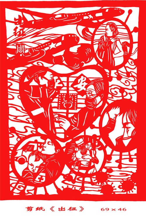 周玉珍作為安康市平利縣的一名小學(xué)美術(shù)教師,在做好學(xué)生、家長(zhǎng)疫情防控宣傳教育的同時(shí),戰(zhàn)“疫”中的許多瞬間,令她分外感動(dòng)。她借個(gè)人居家防護(hù)的時(shí)機(jī),完成了《出征》《逆行者》《戰(zhàn)疫》三幅剪紙作品,用鮮紅的剪紙記錄下了那些令人感動(dòng)的瞬間。