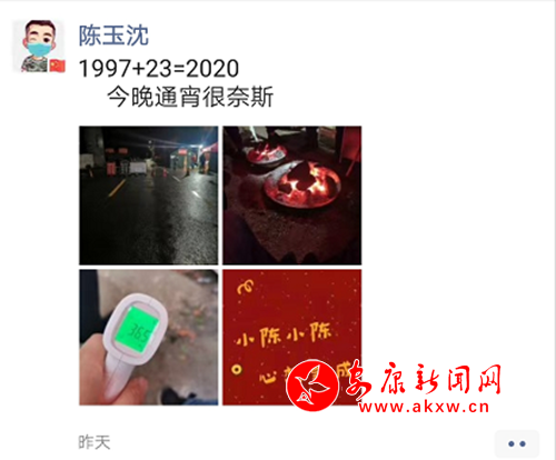 陳玉沈被分派防疫一線后,村上干部一直都在關注他的工作狀況,傍晚的時候村支部書記發現他在朋友圈發了一句“1997+23=2020,今晚通宵很奈斯”的話后,大家才推斷出,今天是陳玉沈23歲生日,他還在堅守崗位,通宵值守。
