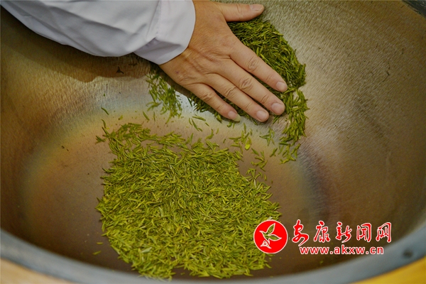 在綠茶生產(chǎn)車間,陣陣茶香撲面而來,沁人心脾。嫩綠的茶芽在制茶師們手中翻飛,炒鍋中響起“噼噼啪啪”的聲音,熱氣縷縷升騰,只見制茶師施展抖、悶、揚(yáng) 、理?xiàng)l、壓、翻等手工制茶動作,鮮嫩的茶芽通過殺青、做形、烘干后根根緊直似針,翠綠養(yǎng)眼的新茶即誕生“出爐”。