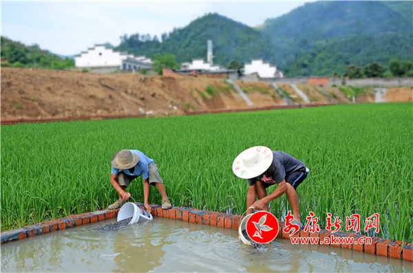 “我家去年種了3畝水稻,投放了50斤魚苗,養(yǎng)大后以40元一斤的價格賣了2000多元,其余的都分給親戚朋友嘗鮮了。我看到效果不錯,今年便多種了兩畝水稻,準備多投放一些魚苗。”領了4桶魚苗的村民賈文林一邊往自家田里放著魚苗一邊說道。