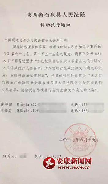 6月19日下午,石泉法院將首批需要進行通信限制的11名“老賴”名單提供給了三大通信公司,要求其協助執行。