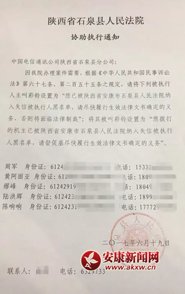 安康新聞網訊(通訊員 尚君)“您撥打的機主已被陜西省安康市石泉縣人民法院納入失信被執行人黑名單,請督促其盡快履行生效法律文書確定的義務”,這樣的彩鈴您從來沒聽過吧!今后,這樣的彩鈴您在生活中或許就會遇到。6月19日,石泉縣人民法院由安康市中級人民法院指定為“通信限制”試點法院,分別與石泉縣移動、電信、聯通三大通信公司協商一致,將通過發送《協助執行通知書》的方式請三大通信公司協助執行,在全省率先對“老賴”實施通信限制。