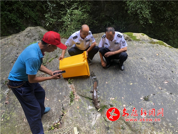 “為了保護漁業資源和水生態環境,我們今天把這條娃娃魚放歸到喜河鎮三星潭流域(雁山瀑布景區安全水域)。這里屬于保護區,且原生態自然環境非常適宜娃娃魚生長。”石泉縣農業綜合執法大隊干部劉晨說道。