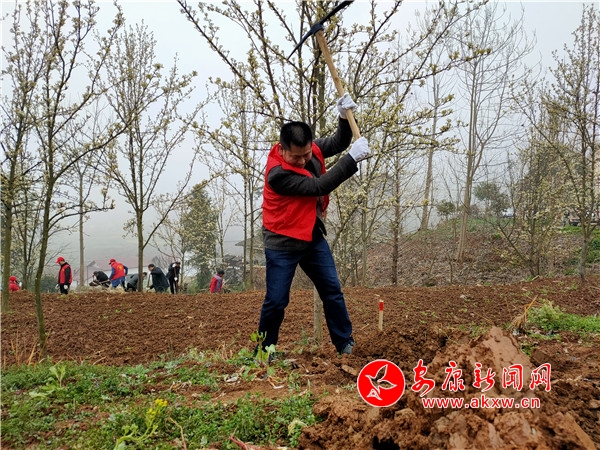 活動現場,全局干部3人一組,相互協作,揮鍬鏟土、挖坑扶苗、培土澆水,熱火朝天。“這個車厘子每畝種植密度是74株,株行距是3米乘3米,要挖一個長寬深是60厘米的坑,你們最好是兩三個人一組,培土要一墊二提三埋四踩,每個動作到位才能提高樹苗成活率”技術人員耐心地給大家講解著種樹要領。經過一上午的辛苦勞作,136株車厘子果樹“安家落戶”。