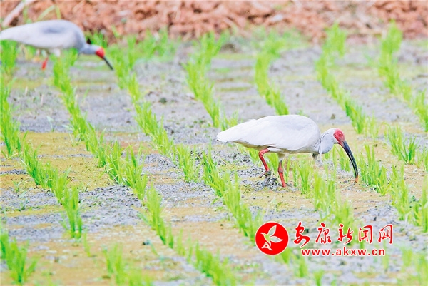 成年朱鹮在草池灣田間覓食