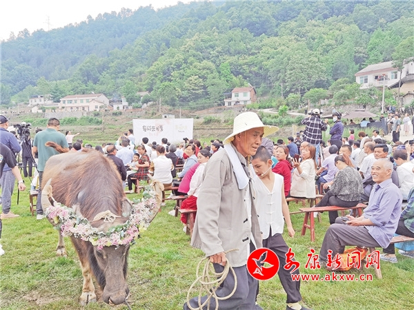 老人孩子牽著裝扮一新的耕牛引人圍觀