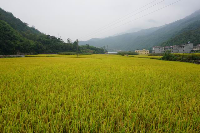 汽車順著一條蜿蜒曲直的水泥路,沿著西岔河逆流而上,疊嶂滴翠,肥鴨戲水,炊煙應(yīng)景,四目張望一梯梯、一片片金黃的稻田,收獲之悅悠然心底。