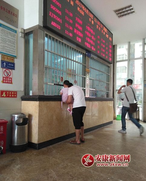 6月13日,旬陽縣汽車站一名家長抱娃咨詢兒童是否符合全票標準。d5t安康新聞網