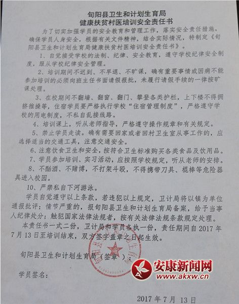 據了解,本次培訓免收培訓費、住宿費、教材費、實習進修費,并由各鎮衛生院在公共衛生補助經費中對參訓的村醫每月予以300元的補助(各鎮衛生院先預支,培訓結束后由縣衛計局統一撥付);對認真參加培訓學習、成績優秀的,適當予以獎勵。5VZ安康新聞網