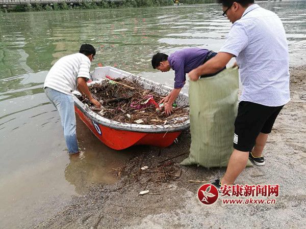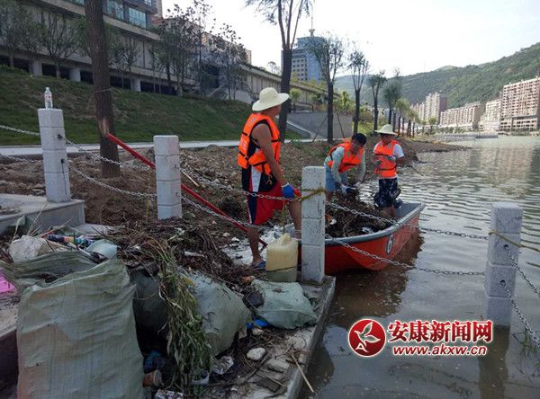 安康新聞網訊(通訊員 王力)7月9日,旬陽縣濱河公園,頂著烈日打撈旬河漂浮垃圾,旬陽縣防汛辦工作人員及漢江綜治辦工作人員 。