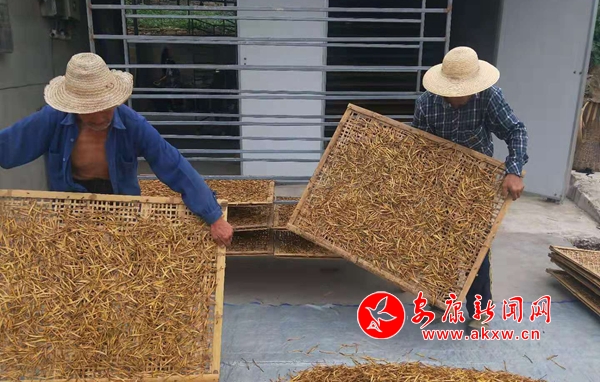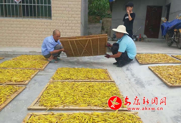 當(dāng)然,要把黃花菜制成成品不單單是采摘回收那么簡單,還需要經(jīng)過殺青、晾曬、烘烤、挑選等多道程序。“現(xiàn)在我們平均每天可以回收新鮮黃花菜四五百斤,制成干黃花后,市場價每斤可以賣到30元左右。”金竹村支部書記、天門山農(nóng)業(yè)專業(yè)合作社理事長詹先斌邊忙碌邊向我們介紹道。三年來,在他和鄉(xiāng)親們的共同努力下,“金竹黃花”在當(dāng)?shù)氐拿麣庠絹碓巾懀鹬翊逄扉T山農(nóng)業(yè)專業(yè)合作社也一步步發(fā)展壯大,成長為一家集種植、生產(chǎn)、加工、銷售黃花菜為一體的綜合性農(nóng)業(yè)專業(yè)合作社,詹先斌成為了村里名副其實的致富“領(lǐng)頭人”。