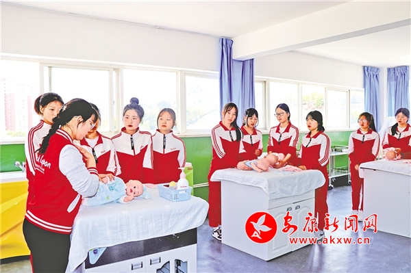 幼兒保育專業學生在課堂上展示幼兒護理技能。5KA安康新聞網
