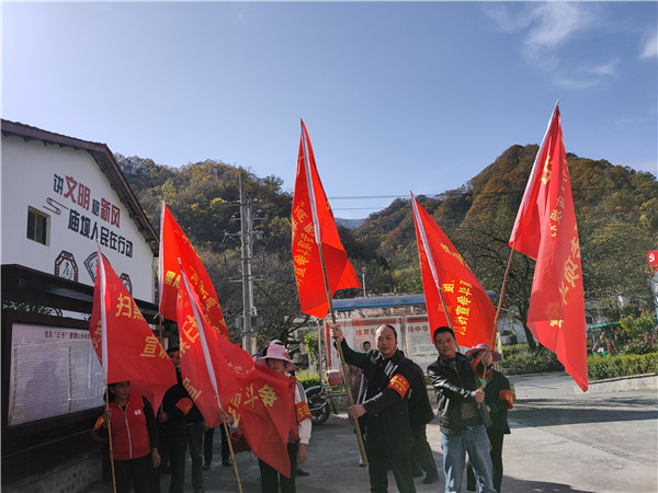 金秋時節,在上竹鎮各村落,肩扛紅旗的宣傳隊伍行走在鄉間小路,為上竹鎮平安建設工作忙碌著。
