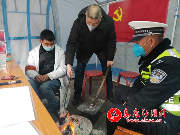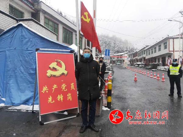 前往值守點的當天,天氣突變,鵝毛般的大雪漫天飛舞。值守點位于縣城最北邊的山頂上,氣溫降至0度以下,盡管大家都添加了保暖衣,換上了厚衣服,但依然感覺渾身瑟瑟發抖,雙頰凍得隱隱作痛。作為東溝埡卡點黨員先鋒崗中黨齡最長、年齡最大的黨員,陳曉華主動要求參加首班值守。按照要求,值勤崗哨必須24小時不離人,盡管室外崗哨兩側都有高清探頭,在室內完全可以監控進出的車輛和行人,但他始終堅守在室外的哨廳,維護卡點秩序、疏導通行車輛、引導行人登記。年輕的同志讓他進屋休息,他說:“大家都在忙,我也不能閑著嘛。既然來了,就不能偷懶。”