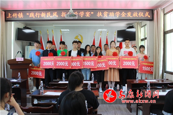 在升學禮上,宣讀了《上竹鎮2020年度“踐行新民風•不辦升學宴”教育扶貧助學活動實施方案》,按照一本2000元,二本1500元的標準為18學生發放了扶貧助學金,共計30500元。學生代表印想想發言,她表示,堅決向“升學宴”“謝師宴”說不,自己會更加努力學習,不負眾望,知恩感恩,做文明新風的倡導者。學生家長代表陳昌瓊在儀式上發言,將一如既往地弘揚新民風,自覺抵制大操大辦、鋪張浪費,做移風易俗的踐行者。在活動現場,學生家長也倍感自豪,臉上洋溢著幸福的笑容,紛紛表示,黨委政府通過開展新穎的慶祝活動,給孩子們留下珍貴的記憶,既達到了革除陋習的目的,讓“里子”好,又讓百姓“面子”亮。
