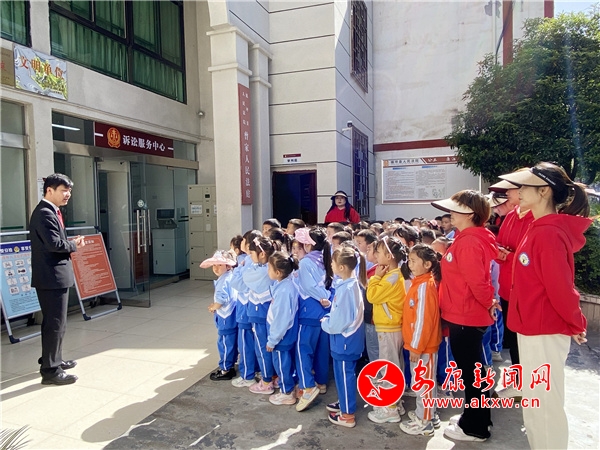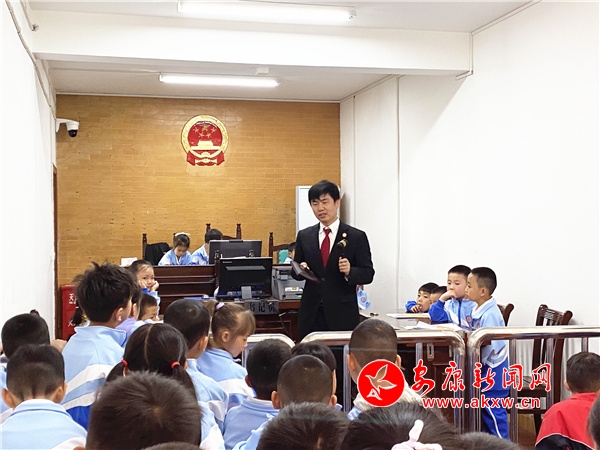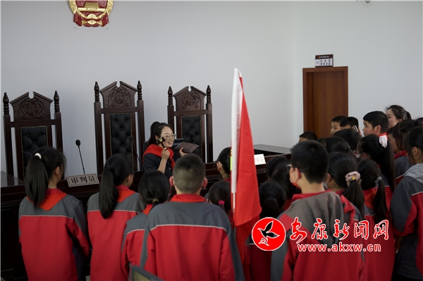 在參觀過程中,干警帶領(lǐng)同學(xué)們走進訴訟服務(wù)中心和干警辦公室了解了法院干警的工作場所。隨后,帶領(lǐng)同學(xué)們參觀審判庭,現(xiàn)場向同學(xué)們介紹科技審判法庭的功能及庭審流程,并展示了法袍、法槌和法徽,同時用深入淺出的語言和提問互動的方式向孩子們講解了法袍、法槌和法徽的象征意義,同學(xué)們興趣濃厚,紛紛走上審判臺,親身感受和觸摸審判設(shè)施,感受法庭審判的嚴肅和莊重。