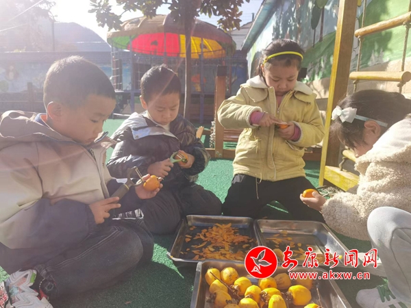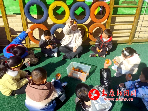 “哇,樹上黃黃的掛著的是什么呀?”“好像是柿子呀!這黃澄澄的柿子可真誘人,真想看一看、嘗一嘗。”老師及時抓住教育契機引導(dǎo)幼兒通過觀察、談話、提問,喚起幼兒已有經(jīng)驗,并引導(dǎo)幼兒從柿子的外形、顏色等特性進行觀察、比較。cnk安康新聞網(wǎng)